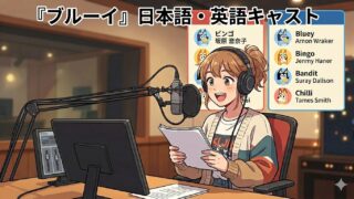 ブルーイ→塙 真奈美、ビンゴ→鳥越 まあや、バンディット→奈良 徹、チリ→小林 希唯。英語版をチェックしようとして驚くのが、ブルーイとビンゴの声優名が公式にクレジットされていないことです。実は、日本語版・英語版ともに、他の有名アニメや映画で活躍されている方がたくさん出演しています。